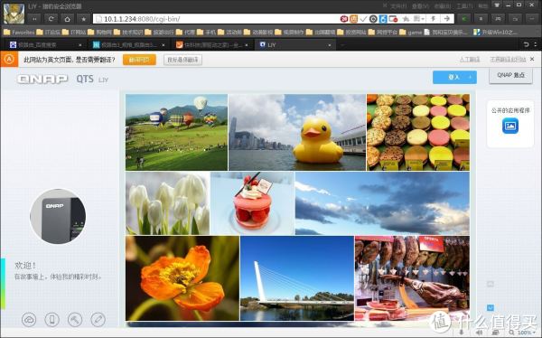 好了,外观介绍不多,还是直接看看NAS的灵魂——内置OS。初始登录界面比较友好,特别是图片墙有我比较喜欢的大黄鸭,点赞。要使用NAS的内置OS,需要开启浏览器并键入对应的网址才可以打开。打开后在右上角点击“登录”。