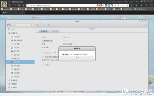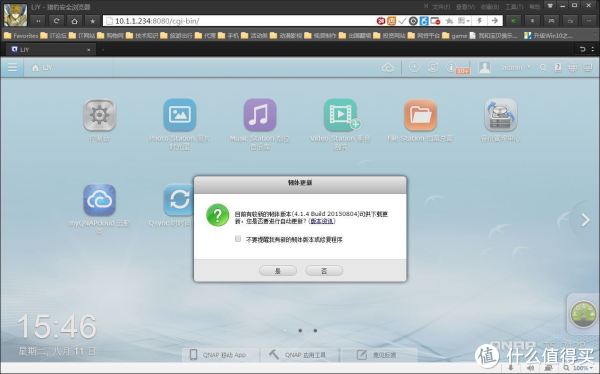 进入OS后,系统自动检测是否需要升级系统。如提示升级,直接点击升级就OK。友情提示:硬盘初次使用需要格式化硬盘,如果你的硬盘不是全新的,那建议你先将硬盘里面的数据拷出来再借NAS。