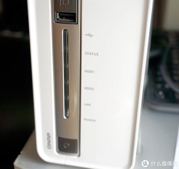 NAS前端是指示灯、开关和USB接口。据说只要插入USB就可以实现自动复制数据,只不过我还没试过,到时试试如何。而指示灯不用我多说,大家一看就懂了。