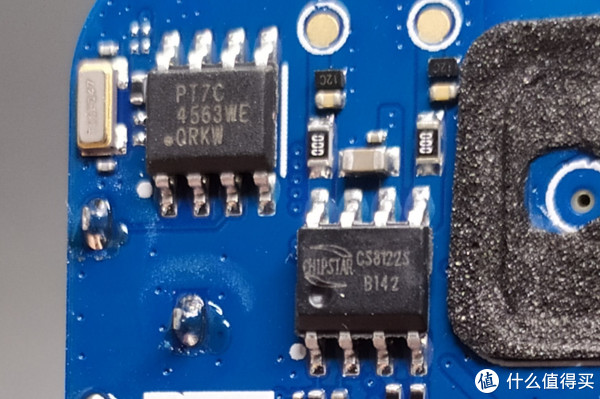 最左边芯片型号为PT7C 4563实时时钟芯片,通过I2C接口与主CPU通信,外置晶振的频率为32.768kHz。