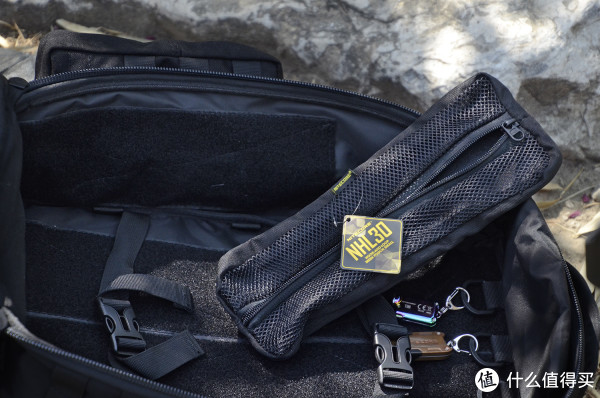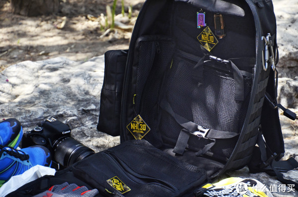 当然了,也可以选择使用后背背板对应的NHL10电脑收纳附包,至少有三个好处:一是NHL10是硬质背板,贴在主包上可以增加背负的稳定性;二是NHL10前部有较厚的软性覆盖,可以保护电脑免受冲击;三是NHL10也有一个网格仓,可以再度增加分类收纳能力。