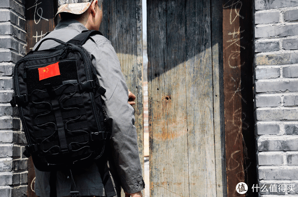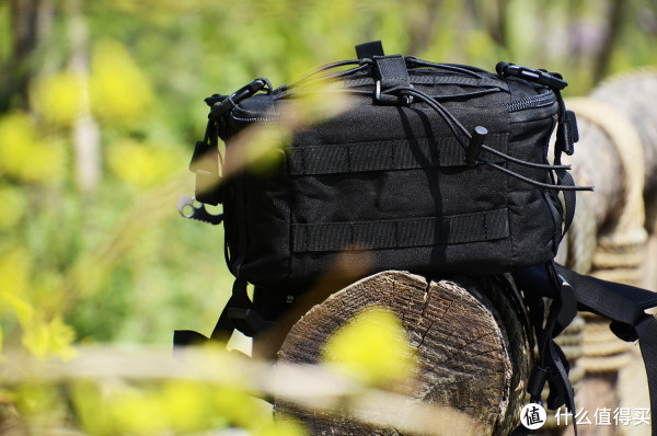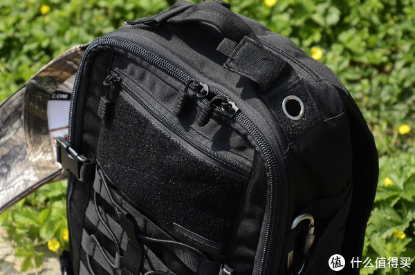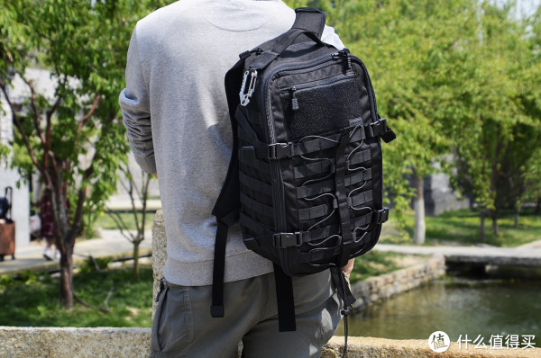 背部两条纵向大面积魔术贴,还有上下两条可调节固定带,如果不加附包至少可以固定15.6寸电脑,装载量可观。