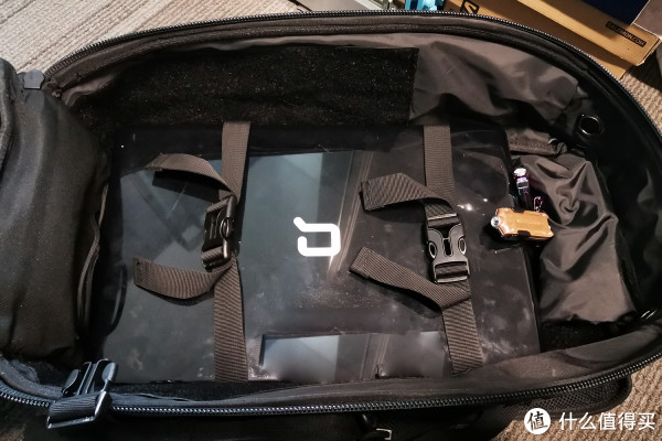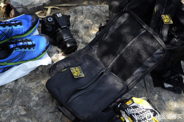 仅有一个主仓,显得BP25收纳的分类性不足。不过没有关系,设计师想到了这点,在BP25内部四面包围性设计了大面积魔术贴。同时,也推出了与之配套的三款内附包(附包需要单独购买)。前盖下部是两条魔术贴,与其上的前盖收纳仓一致,可以配合同样是网格透明的NHL20来使用,这样不用拉开拉链就能看到里面放了什么物品,便于取用。