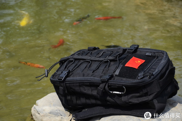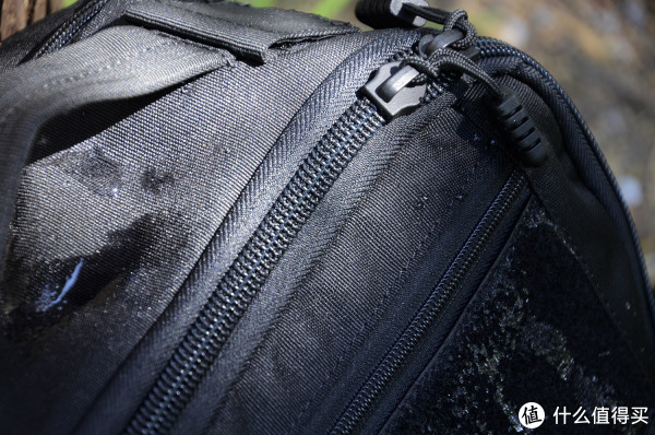 面料表面经过涂层处理,有较好的防水、抗污性能,即便拿着水瓶往上浇,水也会自动流走,不会浸湿面料,保障雨雪天气背负时内部的干燥。但是魔术贴、MOLLE带就没这么幸运了,如果配一条防水罩就完美了。