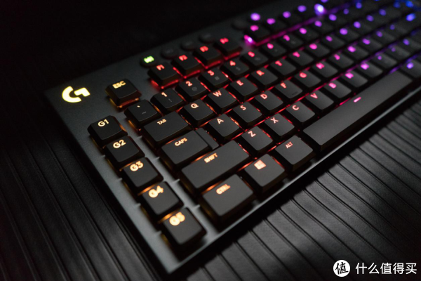 ▲在键盘的左上角位置设计了一个经典的罗技G标识,而且它还采用了RGB灯效的设计,在使用键盘时可以随着键盘的RGB灯效而改变色彩,尤其是在晚上看起来非常的漂亮。