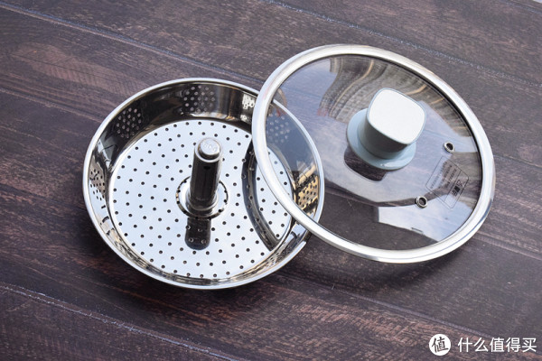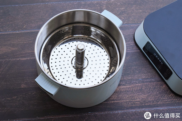 臻米升降式电火锅的颜值还是不错的,整个产品连锅连炉净重2.9公斤,额定功率为1500W,为了保证手持时不会被烫伤,锅体共分三层,其中外层为更耐高温的PP材质,而中层则采用了真空隔热层,最里的内层则是我们常见的食品级304不锈钢了。内胆边缘靠上处有MAX字样的最大刻度,这是加水蒸煮时的最大值,另外臻米电火锅还加入了压力保护防干烧机制,锅内缺水时会自动断电,顶上无锅时是不会工作的。这样在日常使用时会更加安全。附带的提篮夹可以手夹拿取升降盘,既贴心又卫生。