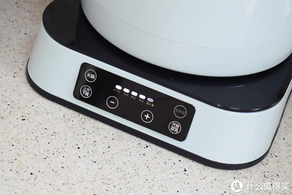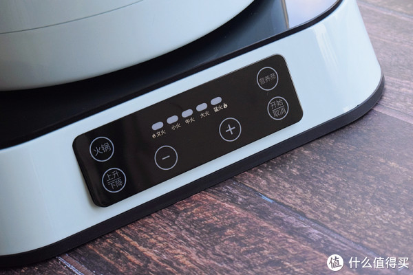 臻米升降式电火锅共有五档火力调节,可以看到其操控面板上的五档排列分别为文火(保温)、小火(慢炖)、中火(煲粥)、大火(蒸煮)和猛火(沸腾),一般吃完火锅后都下点儿面或者饺子什么的,此时中、大火就行,也可以拿来下关东煮。除底部用来控制火温的+/- 键外,四周上下分别是火锅和营养蒸两个模式以及上升/下降控制和开始/取消按钮,操作上十分简单易上手,就不多说了。
