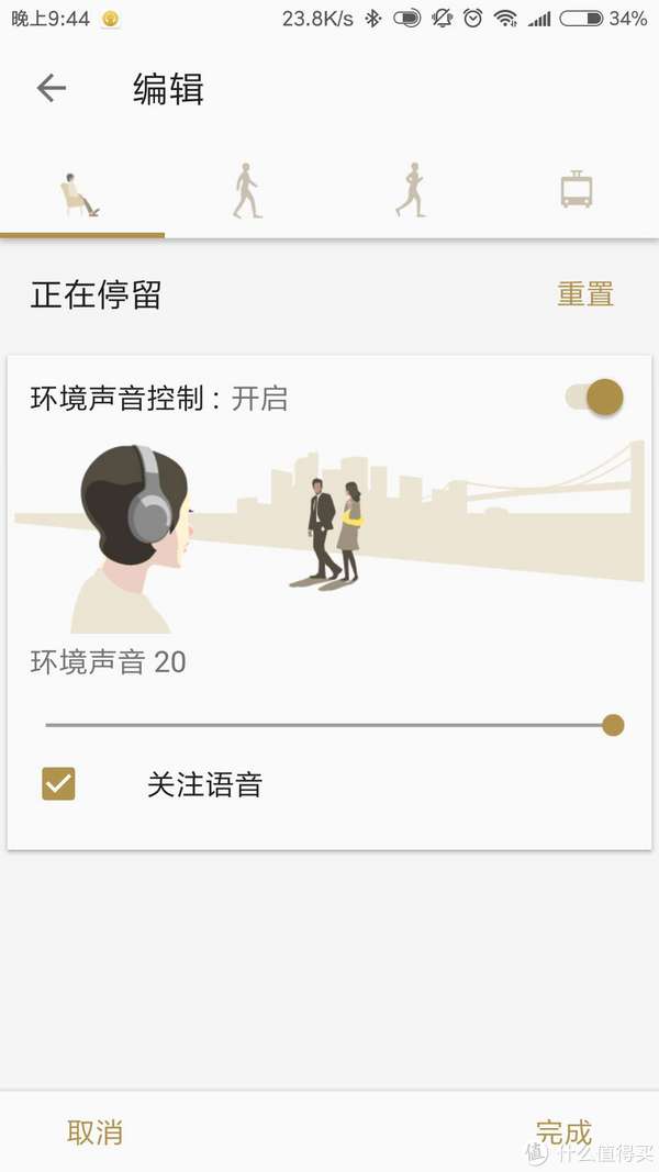 自适应降噪:本次耳机的黑科技之一,通过调用手机的GPS,分析识别出佩戴者所处于的状态,站立、步行、跑步或乘坐交通工具,再自动选择不同的降噪模式,且每一个状态下的降噪模式都可以自定义降噪强度,是否开启环境音或是关注语音,但自身所处的状态实际是比较复杂的,单纯依靠GPS定位的方法来确定不是很准确,我还是更愿意用耳机的降噪按键切换。