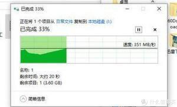 值得一提的是,我们在实际使用时,双盘位的两块硬盘支持同时读取写入,互不干扰。据悉,每个盘位支持最高10T的硬盘,两块硬盘的话,可以为电脑扩容到20T的空间。不过,笔者手里并没有这么大的硬盘,所以并未做测试。接下来,实际测试一下,将电脑存储盘的5.6GB的视频文件拷贝到硬盘盒内的固态硬盘内,从实时截取的写入速度来看。速度可以稳定在300MB/s以上,最高峰值达到了351MB/s,一个5.9Gb的文件,不到一分钟即可完成拷贝,速度非常给力。