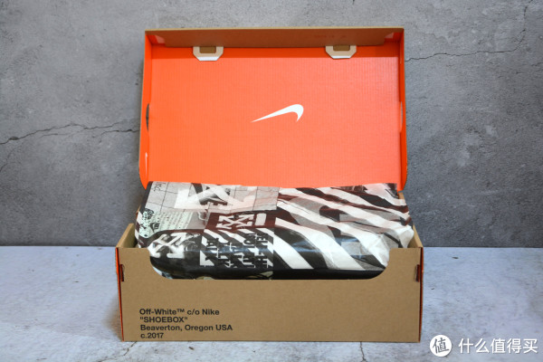 整个鞋盒像是Nike 经典的橙盒翻过来了,防尘纸有两层一张是上图看到的有OFF-WHITE印花的和一张白色普通的。