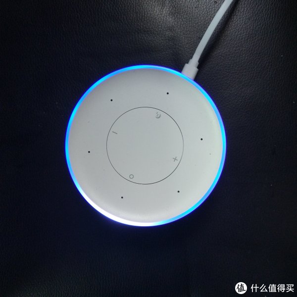 然后就是重头戏,这个音箱了,本来对于这个到手价仅仅79元的设备并没有什么大期待,特别是在做工上,但让人惊喜的是,这个做工还是非常不错的。顶部有点磨砂质感,设计上很常规,外侧是6个麦克风,然后就是音量键和唤醒键和休眠键。最能体现精致感的就是顶部这个环形灯带了,灯光效果不错,一会上图。