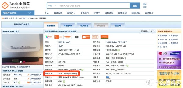 在“屏库”网站上查找这个型号还真能找到,屏幕的品牌为群创、对比度为700:1、72% CIE1931色域(貌似就等于72% NTSC)。