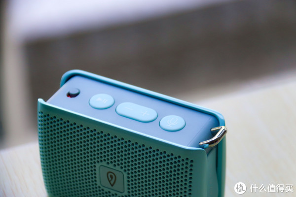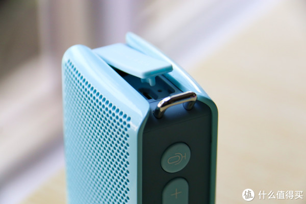 音箱侧面还有一个防尘盖设计,打开后是一些接口和指示灯。其上分别是一个USB充电插口,一个充电指示灯,其下依次是3.5mm音频AUX输入接口和TF卡插槽。而设计这两类接口的目的在于使其可以运用到更多的场景之中,比如跳广场舞之类的。
