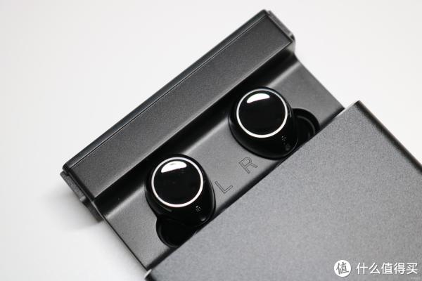 ▲再来看真机外貌,黑色方形硬朗的电池仓外形,俊朗耐看,镜面的背景下印着它的简单的英文logo图标,这个logo也不仅仅是一个图标,它也是这个指示灯,当耳机电池仓充电时都会不停地闪烁,还会随着电池仓充电的电量状况改变闪烁状态,当电池仓充满电量时,顶部显示灯会连续闪烁四次(电量少闪,烁次数越少),耳机的炫彩蓝光也会保持常亮的状态,非常简约独特!刚开始并没发现,后面使用才觉惊喜!