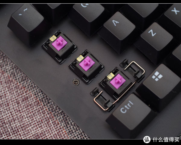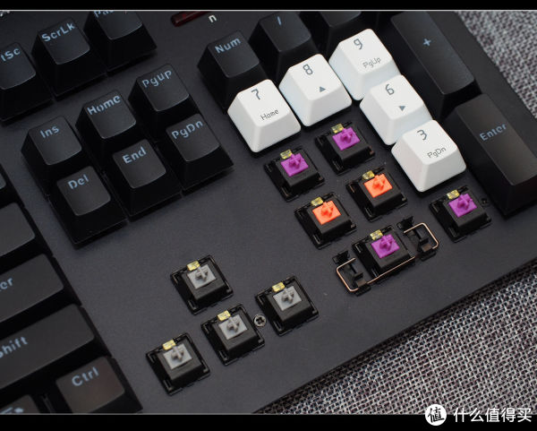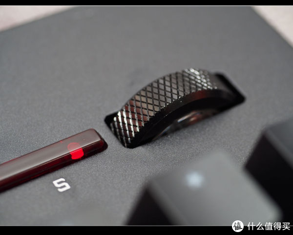拔轴相对来说要麻烦点,原因在于这个拔轴工具卡不住,拔的时候要更要技巧点。相对于较难的拔出,安装新轴体非常简单,只要对准的导光条轻轻摁下就可以。掌握好技巧后,整个换轴换键帽的过程还是非常快的,比如我就将方向键换成了最爽快直接的灰轴,这样和朋友双打游戏的时候更爽快点,哈哈。。