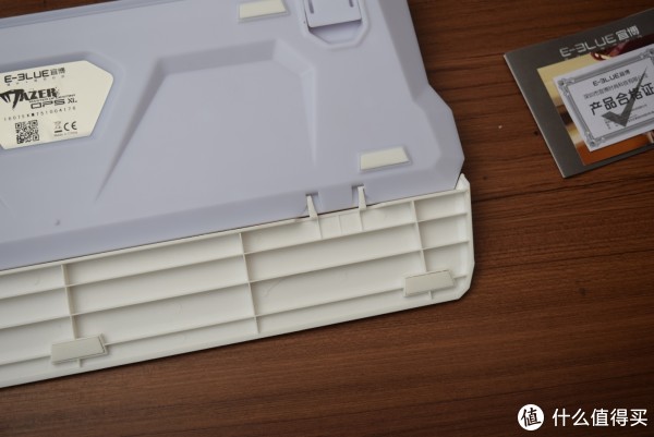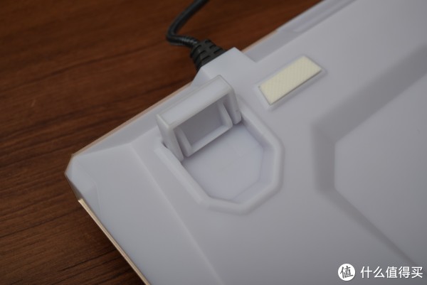 链接后的整体效果。键盘背部颜色与手托颜色貌似有些不搭。还好是背面。键盘背部也是这种整体性的之间转角设计。与正面设计语言统一,四个防滑垫面积足够,加上键盘本身的自重,推动键盘还是需要点力气的?