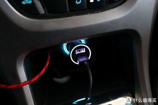 想必大家都会安装车载支架,这里不再啰嗦,不过再一次提醒各位一定要使用红色接口连接点烟器适配器!适配器插进点烟器,亮起一圈蓝色灯,提示已经通电。