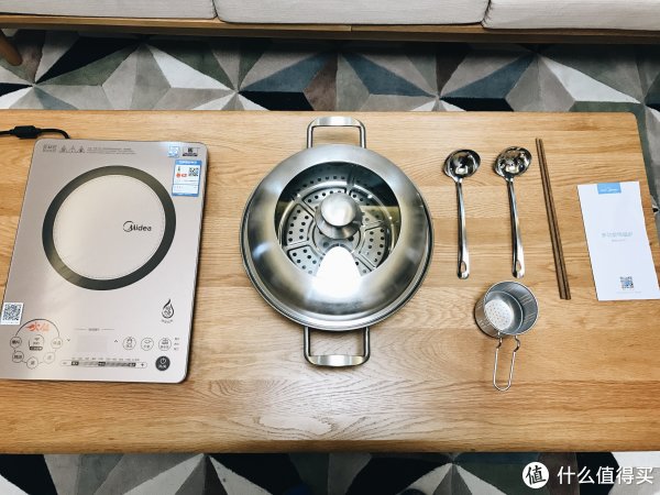 除了有火锅功能加成的电磁炉,鸳鸯火锅,还配有汤勺,漏勺,长筷,以及吃肉同学最爱的锅边漏勺。