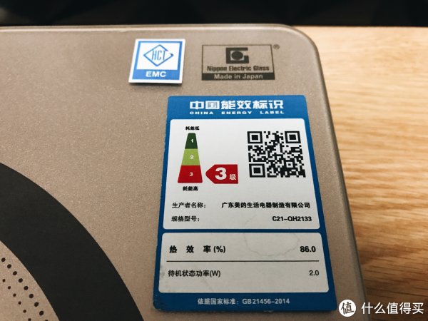 面板采用了日本电气硝子(Nippon Electric Glass)的玻璃面板,和大猩猩康宁公司差不多,做玻璃,显示屏啥的,日本制作,质感很好,耐温差效果(电磁炉忽高忽低的温度)很好,宣传是800°温差都不会破裂,看以后使用效果会再跟大家报告,电磁炉也通过了EMC认证,安全有保障。