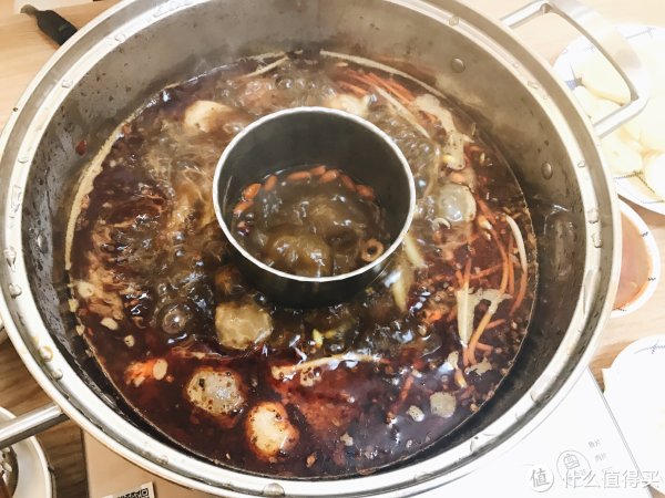 如果是一般煲汤,或者做椰子鸡直接将食材放进去就行啦。要是吃火锅的话,就要用到这个火锅底座了。底座的中间是给用户放请清淡口味汤料,四周辣味的部分底部做了镂空的处理,主要是为了防止例如粉丝这类食材沾锅,但是有一个缺点,就是清/辣之间没有采用一体成型的铸造工艺,不知道使用多了,两个区间会不会串味。