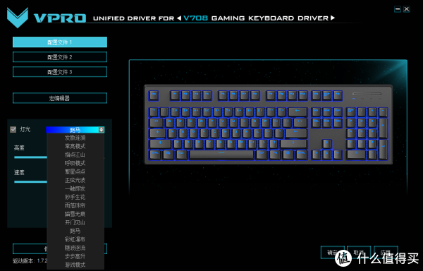 在使用数据线连接电脑并按下Fn+4后,V708就是一块标准的有线键盘,此时不仅支持全键无冲(游戏党可以放心了),还可以通过PC程序进行更复杂的设置,除了预设的多种背光效果,还可以自定义背光,并对全部按键进行自定义操作,例如设置组合键、录制宏指令等,使用键盘连招就简单多了,对游戏党来说是非常实用的个功能。按下Fn+Pause进入游戏模式即可载入预设,再次按下则可返回办公模式。