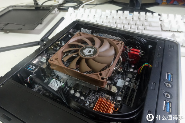 开机,一次点亮,一切都还是没有任何问题的。当时当我走好线准备将侧板给装上的时候...就华丽丽的悲剧了。大概高出了10mm左右,目测7860k自带的散热器高度在60mm左右。虽然AMD自带的双热管散热器感觉还是相当的良心,也算不上吵,但是盖不上盖这个问题还是十分悲剧的。考虑再三,该买的还是得买,于是又乖乖掏了79块买了个ID Cooling IS40静音版。