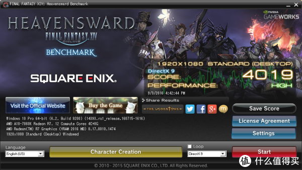 Intel i3默秒全...嘛,在单核性能上来看AMD还是有相当的距离要追的,Turbo Core能够到达4.0GHZ的水平也依旧和Intel四代i3 3.5GHZ有了接近40%的差距,想想i3 6100。唉,这里还是期待Zen能够有更好的单核性能吧。但是多线程能力显然依靠着更多的核心,7860K还是有更强的能力,在多核多线程优化的越来越好的今日,其实7860K的CPU性能还是相当值得信赖的。真要还是嫌不够用那就超超频呗。Samsung 750 EVO的表现也是中规中矩,读写在500M/s的水平对我来说也是够用了。简单看了下悲惨的CPU能力部分,就到APU最大的卖点核显部分了。考虑到核显主要还是用来玩网游以及低画质下畅玩各类大作,接下来就用画质要求相对较高的Final Fantasy 14新出的Heaven Sward Benchmark来测试一下7860K的iGPU能力。
