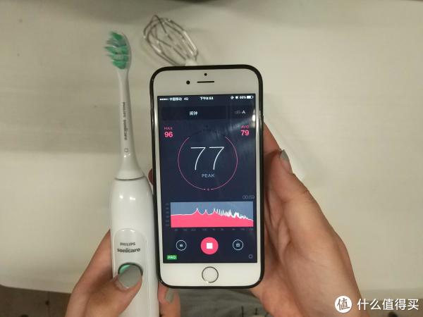 为了更加直观的表现它的声音,我拿了自己的电动牙刷也做了分贝测试,77分贝,对了牙刷是飞利浦的,也算是比较安静的小家伙吧