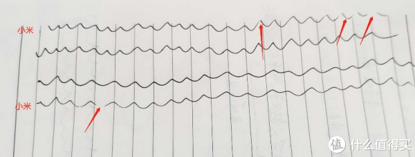 对比中可以看出,小米的笔在中间会有一些断墨的情况,而使用了很久的办公发的的晨光没有这个问题。