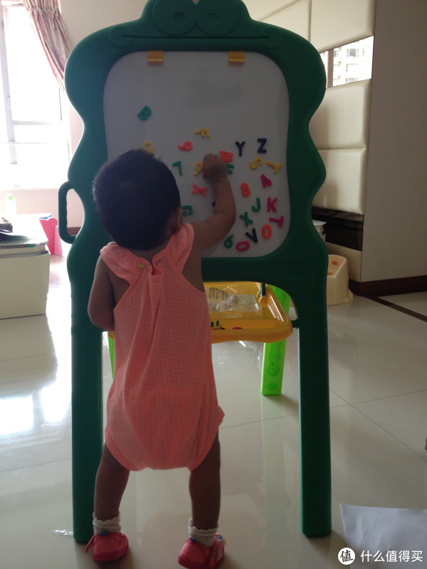 给个参考,小朋友身高估计80CM,14个月,勉强够到画板中央,“点点点”的时候也是只能画(zao)到(ta)画板下半部分。