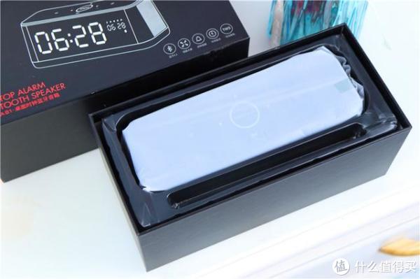 打开包装,便可以看到这款蓝牙音箱了,静静地躺在了塑料内衬的凹槽内,机身表面还有一层磨砂的塑料袋包裹,起到了很好的防尘,防潮的作用。配件则在音箱下面。