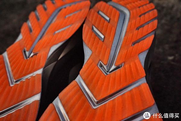 缓震感9.5/10:DNA AMP有点类似N牌的R科技,一开始的脚感不会很软,但也不会硬。跑起来时就像加厚版的BOOST,很弹很弹。特别是前掌落地和蹬地的感觉很好,宽大的前掌除了带来稳定性,还有一种很明显的回弹感。Brooks利用鞋子外形增加体验感的手法已炉火纯青,除了中底缓震科技外,外侧的菱形设计增加了回馈感稳定性,足底的分组设计降低足底的压力。