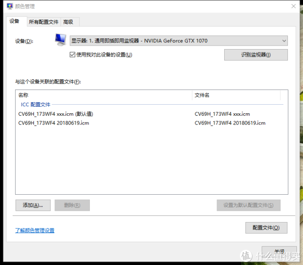我先做的是飞利浦屏,最后做完了,发现是三星屏在变。当时我只是奇怪,又校完三星屏,出结果时是飞利浦屏在变化。然后,校色文件就这么错用了,两个屏似乎交换了icm文件!我心下奇怪,当我去看系统颜色管理的时候,才发现在飞利浦的icm文件选择里,有三星的icm文件可选,三星的icm也可选飞利浦的icm,只有笔记本原装的lg屏没有混乱。这样的校色结果混用,我不知道到底是不是就意味着校色仪的软件缺陷,但起码对用户,是非常大的困扰。(对比效果错屏算是比较小概率,但icm文件错用是随时可验证的,三个显示器情况下大概率错乱。下面一堆没错乱的是我拔了一个显示器后校的。)