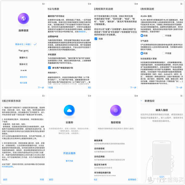 初次开机,会有各种协议与条款需要确认。荣耀9 的内置语言十分丰富,搭载了几十国的语言,这也是华为手机走向世界的一个原因吧?云服务自然是不可缺少的,注册华为账号,可享受华为云服务,重要的照片,视频还有通讯录再也不怕丢失了。