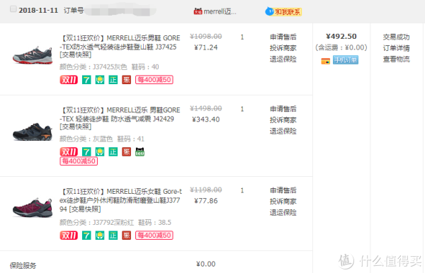 按天猫活动规则,订单中物品总价满2000是最划算的,2000-1000-50*5-75折活动物品价格*25%,在凑了几次之后,三双Goretex徒步鞋总计2024,实付492.5,简直做梦也会笑了O(∩_∩)O哈哈~