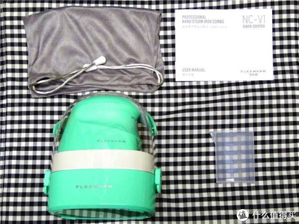 打开箱子,这款松石绿的小熨斗映入眼帘,机身随机配置了收纳袋、说明书以及小水杯。