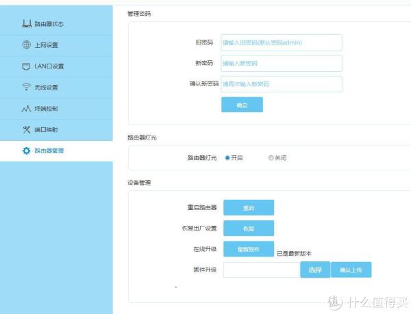 12、路由器管理功能,可以关闭前置的灯光,以及固件升级等: