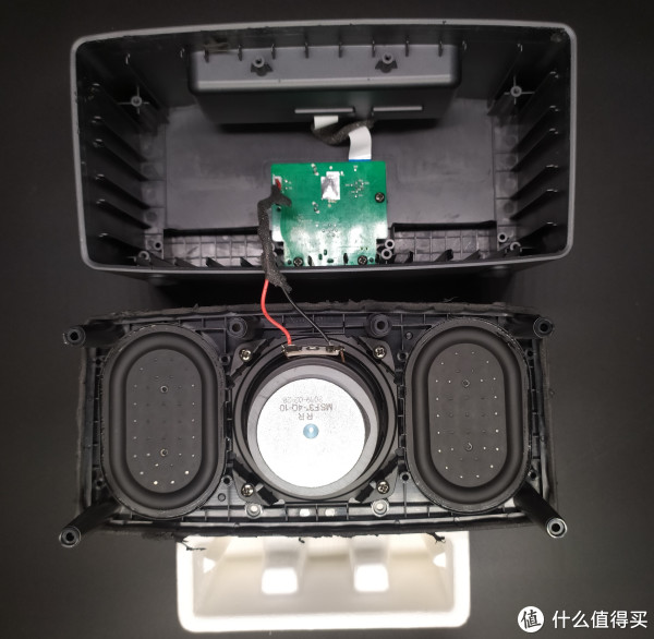 取出音腔顶盖后,可看到音腔顶盖由1个喇叭+2个被动振膜组成,喇叭与主板之间通过2Pin的排线连接,排线上包裹有软绵,防止排线因振动而发出噪声。
