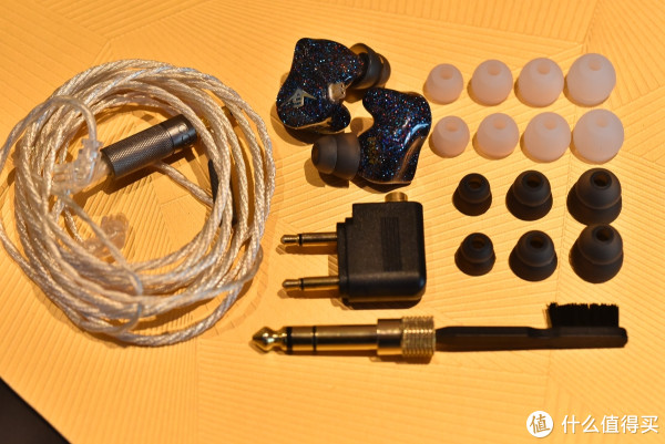 据闻qdc耳塞里,5单元以上的产品,包装盒统一为烫金纸盒大包,内附耳机型号铭牌,产品保修卡及资料。配件方面,配备:航空插头一枚,清洁棒一枚,3.5mm转6.3mm插头一枚,透明硅胶套四对,灰色双节套三对,橙色圆形耳机收纳盒一个。