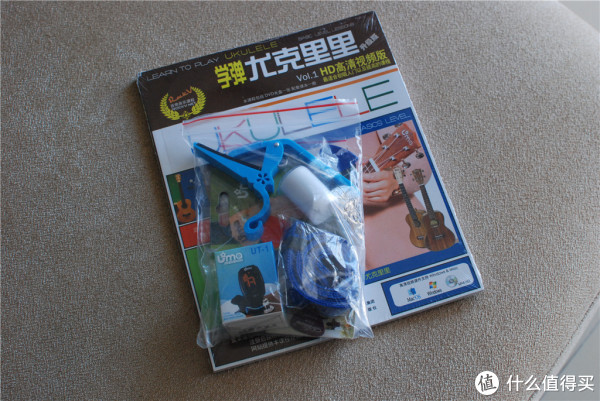 这是送的一堆东西,这本书里有一张光盘 光盘里有教程 坑爹啊,教程第一课就推荐初学者买合板的琴,打击锕。。。老板推荐的面单的。。。。