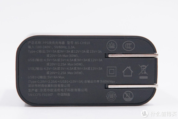 充电器插脚侧印着产品的参数信息。