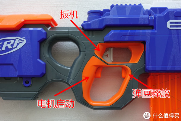 看似科幻的造型,握持设计还是比较符合人体工学的,食指扣住扳机,其余手指自然握住手柄。因为是国行3C,所以灰色扳机也是必须的。电动发射器的射速/射程主要取决于电池,灰机/橙机的差异在手动发射器上表现的更明显些(弹簧力度)。按住电机启动键不要松手,3秒后扣动扳机即可发射。按下弹匣释放键可轻松取下弹匣(弹鼓)。