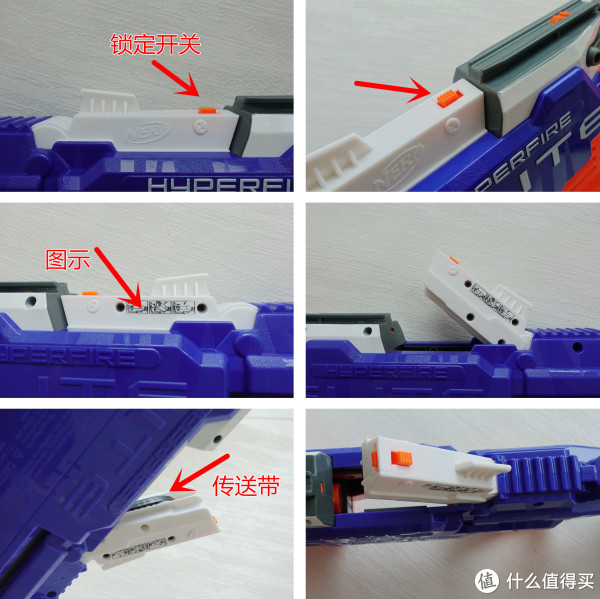 和之前的NERF发射器比较明显的区别是,超E更改了卡弹仓的设计,多加了个锁定开关,以防误碰。内部也采用了让软弹传输更平滑稳定的传送带设计。基本上在游戏中没有出现卡弹的现象。