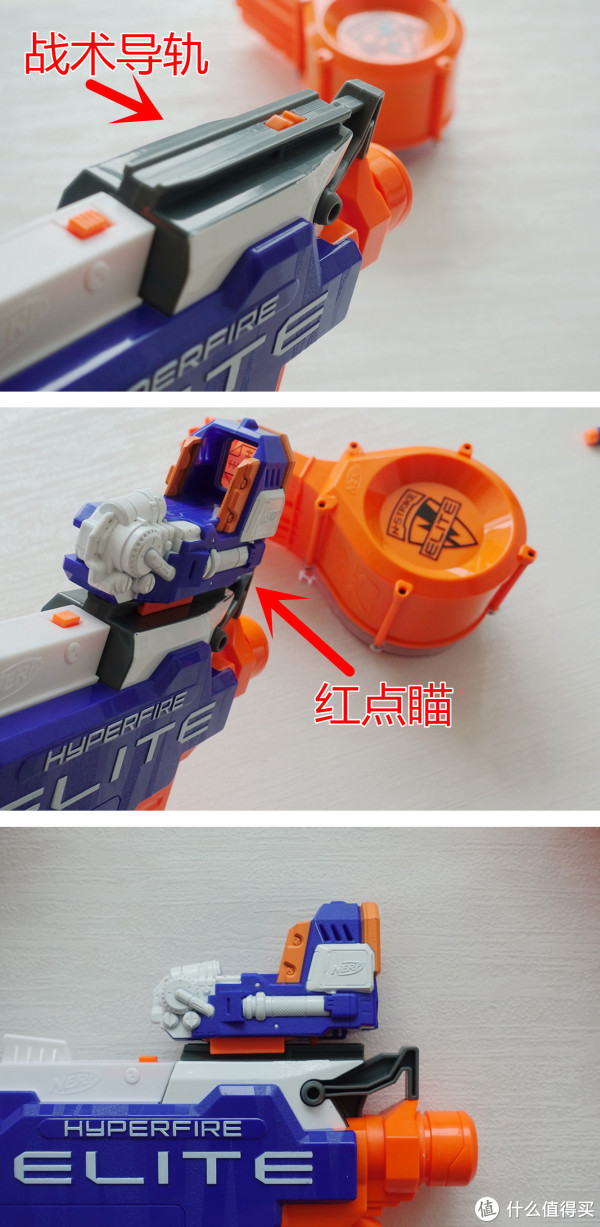 战术导轨也是NERF的标配了。老款的精英系列内红瞄和超E搭配起来非常和谐。新款的电瞄是黑色的,和精英系列不太搭调。纯装饰作用,电动发射器的弹道相当飘忽,不要指望瞄准器能有什么帮助。