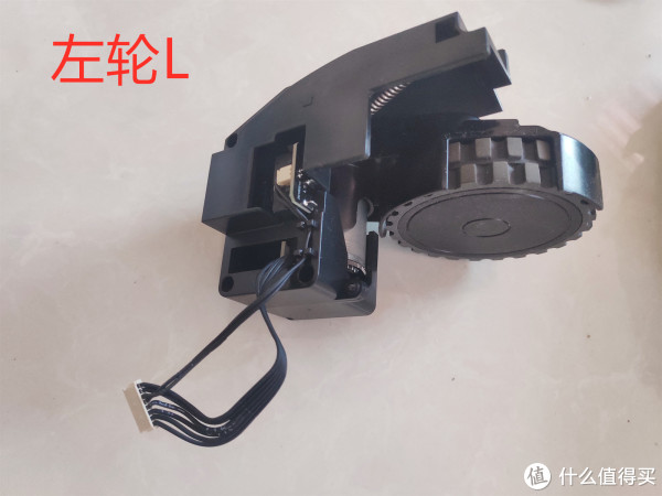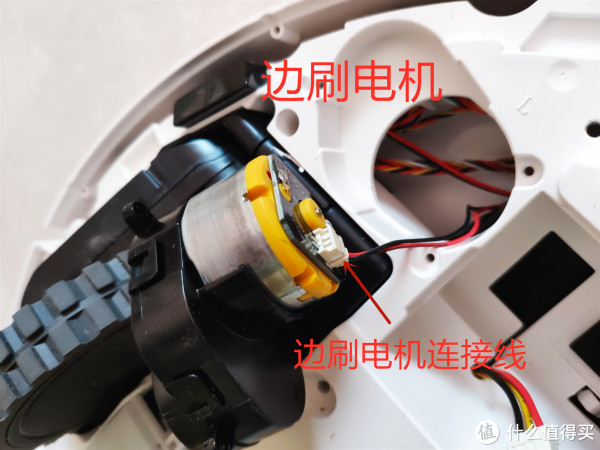继续拆掉底壳的剩余螺钉,发现除了主刷,主刷罩和两个边刷电机,还有电池可以拆下来外,其余的无法再继续拆卸。两个边刷电机上边分别由左右(L,R)的标识,应该是方便识别和组装,边刷下方都有连接器,通过线束连接到主板上。