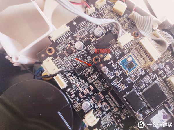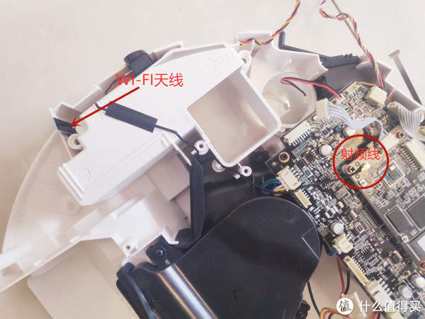 主板到底壳边缘有一根射频线相连,底壳部分应该是天线。这在手机上非常常见,在扫地机器人上估计应该是WIFI的天线