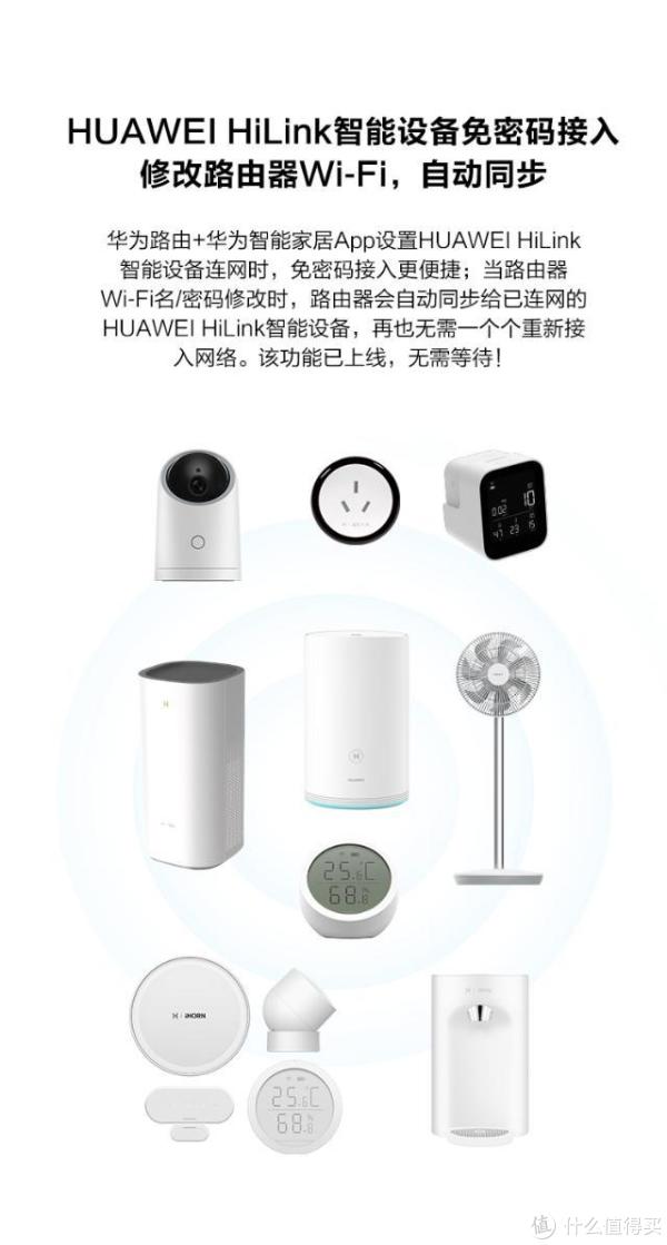 路由器正面有华为智能家居HiLink标志,支持HiLink设备免密一键互联。如果更改路由器了路由器密码,已经连接的设备会自动同步,无需一个个单独连接。给重度花粉和展品门店等带来极大方便。