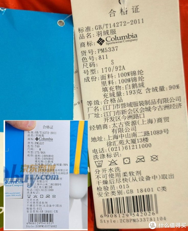 这里要指出一些问题(见下图,小标牌是JD曾经卖的同款羽绒上的标牌,大标牌是本款):