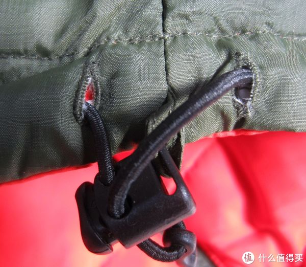 挂起来的样子如下,衣服是两面可穿的,所以里外都有LOGO+口袋,不同的是橘红色一面多胸前一个口袋,军绿色没有。另外衣领+两个袖子都带有连接的绳环,表明这个是可以作冲锋衣内胆来穿着的。