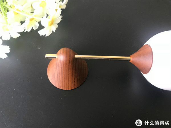 向物小明感应小夜灯采用的是胡桃木色底座以及金色挂架,底部不需要螺丝固定,而是采用强力3M胶贴进行粘接。